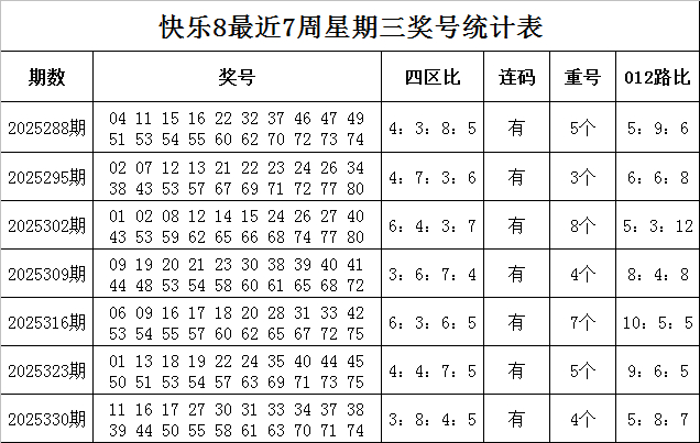 福彩快乐8第2025330期(上周三)奖号回顾:11 16 17 27 30 31 33 34 37 38 39 44 50 55 58 61 63 70 71 74,其中奖号四区比为3:8:4:5,012路比为5:8:7,包含4个重号44、50、63、71,包含连码16 17、30 31、33 34、37 38 39、70 71。