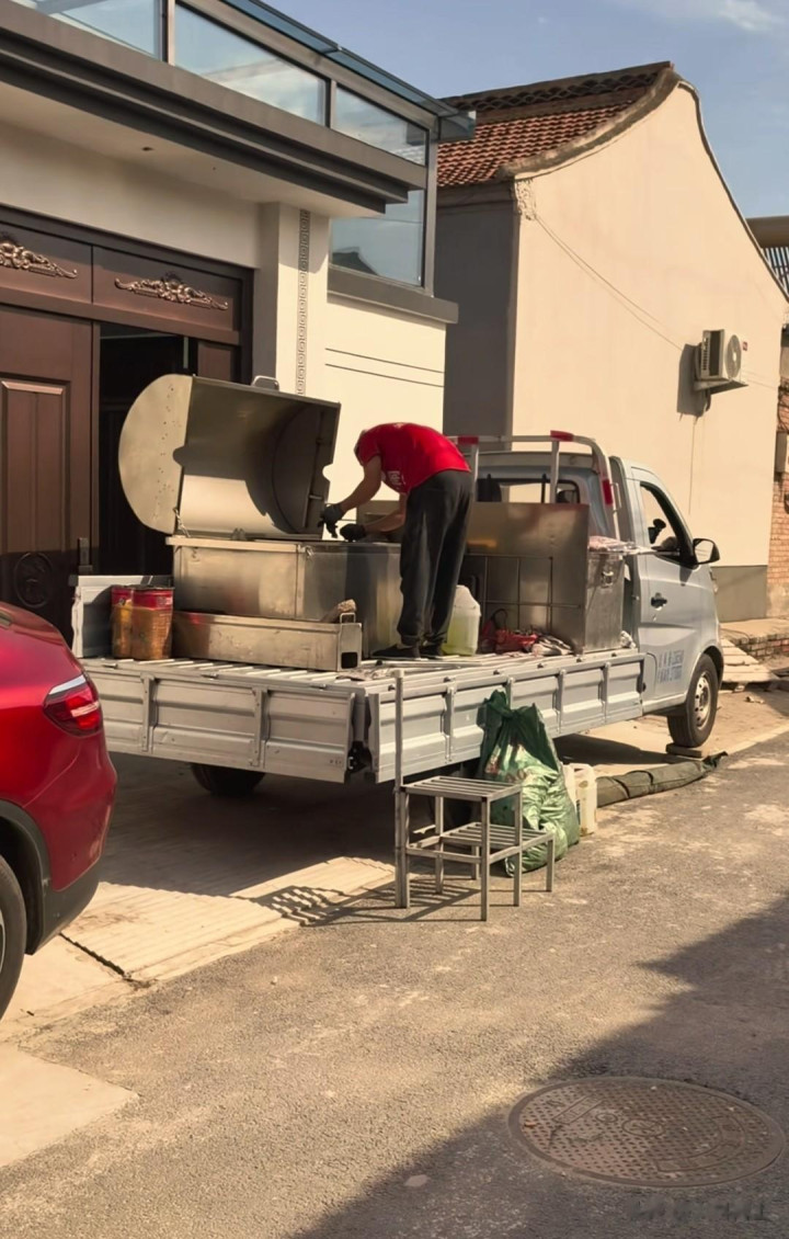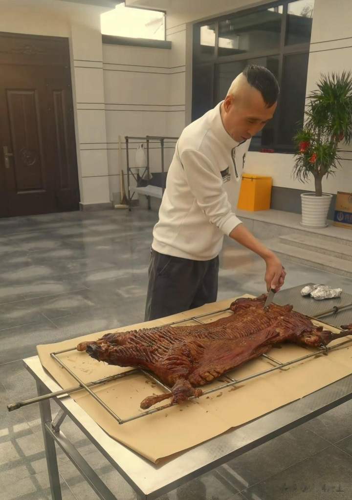 条子哥特意订了一只烤全羊招待朋友,在新宅的宽敞的院子里,条子哥亲手给烤全羊开刀,院子一角,摆着两张桌子,桌上已经摆了不少酒水饭菜;