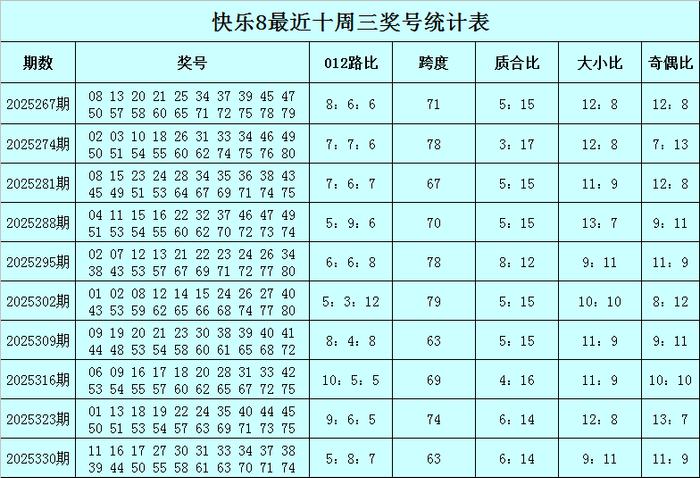 福彩快乐8第2025336期开奖回顾:01 06 08 10 11 13 20 26 27 29 41 43 54 55 59 61 62 71 76 80,其中奖号012路比为3:7:10,跨度为79,质合比为9:11,大小比为10:10,奇偶比为11:9。