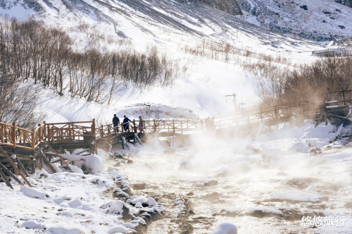 北纬42度的优质冰雪旅游胜地。白雪覆盖整片山林,雾凇挂满树枝,温泉蒸汽在冰雪间袅袅升起。