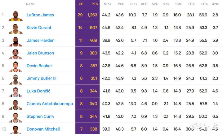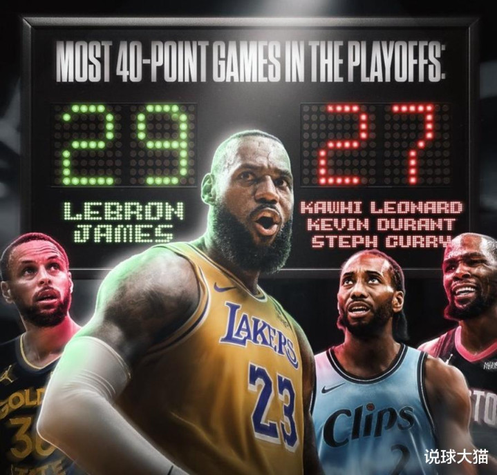 作为季后赛参与场次最多的现役球员,詹姆斯在目前已经拿到了29次单场40+得分,其中命中率达到了56.9%!