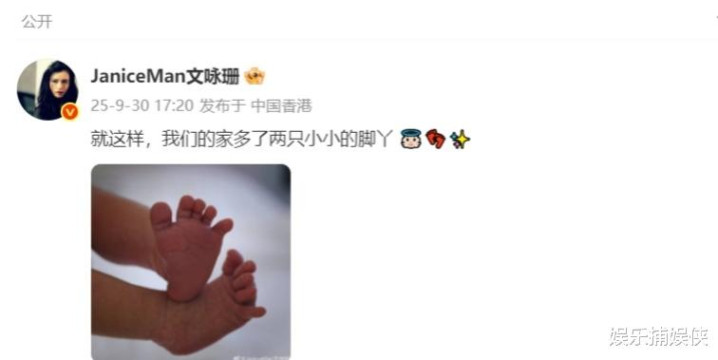 文咏珊在社交平台大大方方地晒出了宝宝的脚丫照,还配文说:“就这样,我们的家多了两只小小的脚丫 ” 这文案,简直甜到掉牙,隔着屏幕都能感受到她满满的幸福,仿佛在说:“看呐,我家新来的小宝贝,可爱到犯规!”